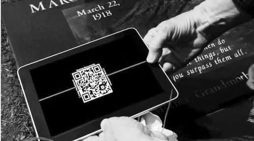 英美等国的一些公司已经开始销售一种带有二维码的墓碑,人们在前往墓园祭扫时,只需用手机扫描一下墓碑上的二维码,便可以进入逝者的网上个人主页。在这里,人们可以看到各种各样与逝者有关的信息,包括照片、视频、纪念文章以及亲朋好友的留言等。人们也可以方便地加入新的留言或者其他资料,表达自己的哀思,并与其他亲朋互动,一起怀念逝者。