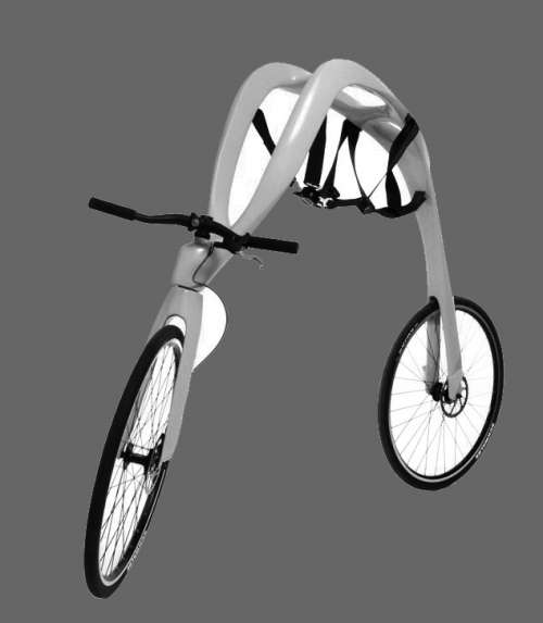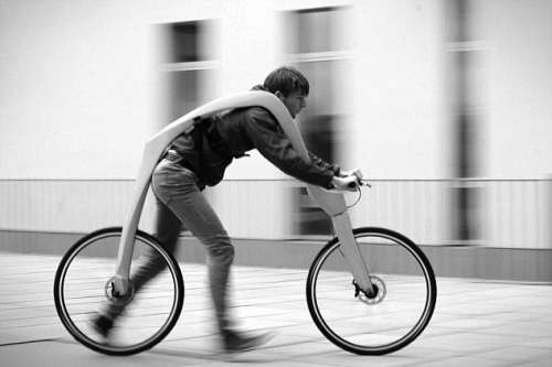 据英国《每日邮报》9月6日报道,德国两名学生最近发明了一种全新概念的自行车,它不但没有踏板和链条,甚至连车座都没有。车手在骑行时,需要把自己用扎带吊在车架上,然后通过两脚蹬地,来“推着”自行车前进。