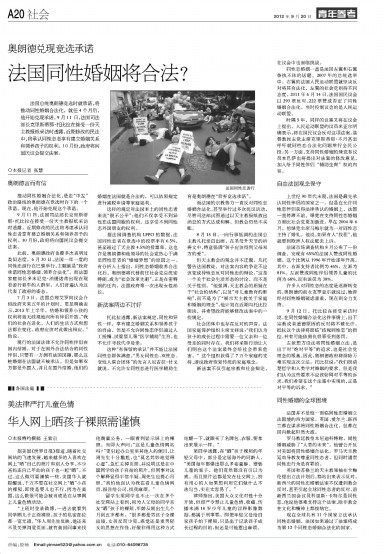 7月3日,法国总理艾罗向议会介绍政府未来五年的计划时,更是明确表示,2013年上半年,结婚和领养小孩的权利将毫无歧视地向所有伴侣开放。“我们的社会在进化,人们的生活方式和想法都在变化。政府应该对此做出相应。”他说。