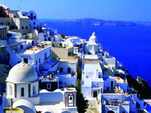 在桑托林岛度过的头一个夜晚,狂风像疯狂的汽笛组成的乐队般嚎叫不停。次日破晓,风暴却隐匿无踪,我推开卧室的门,顿时被整个爱琴海上最壮丽的景色夺去了灵魂。