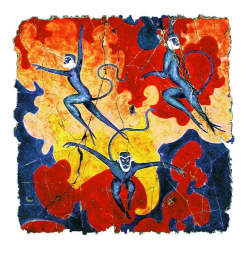 岛上的考古工作比之前想象得更复杂,成果也更诱人。发掘曾暂停一段时间,今年早些时候重新开工。那座被掩埋的遗迹恍若来自某部灾难片,上面新加的木头和钢材的顶盖倒有几分科幻。抛开这些不提,马里纳托斯和后来者们发掘出的壁画,无论用什么标准衡量都令人赞叹。画面内容丰富:年轻的拳击手留着长发、怒目圆睁,用力击打对方,还有大型划桨船组成的远征商队、端庄文雅的裸胸少妇,间或有几只蓝色的灵长类动物在棕榈树间跳来跳去,重见天日的它们,仿佛想用欢快的叫声打破施工现场的沉默。
