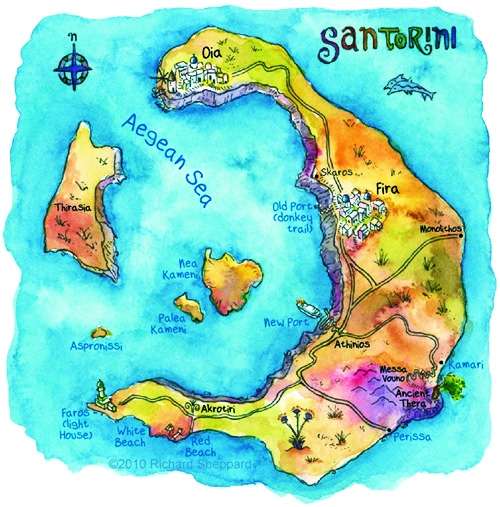 往爱琴海深处望去,目力所及处散布着许多更小的岩石、峭壁、礁盘,锋利的截面两侧的断层不知被谁绘上绚丽的色彩:砂灰色、白赭色、铁红色……不同的颜色标志着数万年来频繁发生的地质变动,像老树的年轮那样,直至公元前17世纪的某一天戛然而止。