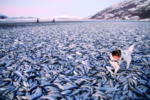 2012年1月2日,一只小狗走在挪威Kvaenes海滩的死鲱鱼堆上。 |