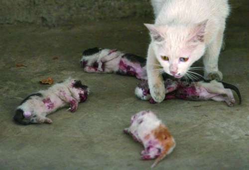 2006年4月11日,昆明盘龙区一法院家属区内的4只小猫被人虐待而死。母猫悲伤地舔着小猫的尸体。 |