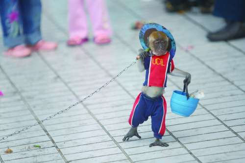 2012年7月11日,一只穿着衣服的猴子在印度尼西亚雅加达街头为主人卖艺赚钱。 |