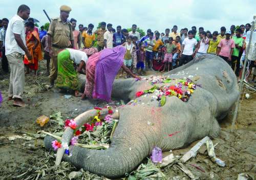 2012年8月20日,印度西里古里的村民为死去的雄性野象举行仪式,表达敬意。森林警察怀疑这头野象是在印度和尼泊尔边界地区遭到偷猎者袭击,因其尸体上有几处弹孔。 |