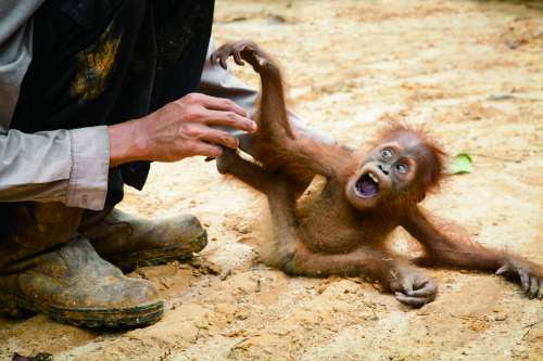2012年9月28日,印尼苏门答腊岛的动物保护人员正在检查一只不慎从树上坠下的猩猩。由于人类砍伐当地的棕榈树林,猩猩的生存受到了很大影响,时常被人类惊吓。目前人们已采取措施在当地补种树木。 |