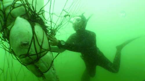 一段视频显示,“鲨鱼天使”组织的成员在南非西开普省海域解救被渔网困住的鲨鱼。虽然鲨鱼是种很危险的动物,但该组织希望人们不要忽视这样一个事实——鲨鱼正在走向灭绝。因为人类对鱼翅或其他鲨鱼制品的需求,每年约有7000万头鲨鱼被捕杀。 |