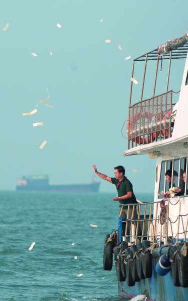 这一天的香港的天是阴沉的。这个已经接连三天降半旗的城市,在10月7日承载了更多的哀思,中午,港九小轮公司旗下所有的渡轮为6天前一场事故的死难者鸣笛致哀,午后,道教联合会派出的220位经师在海怡半岛码头上诵念经文,200多位市民坐船到海中央,为他们刚刚失去的亲人撒上漫天洁白的纸钱,白色的菊花也纷纷被抛入海。