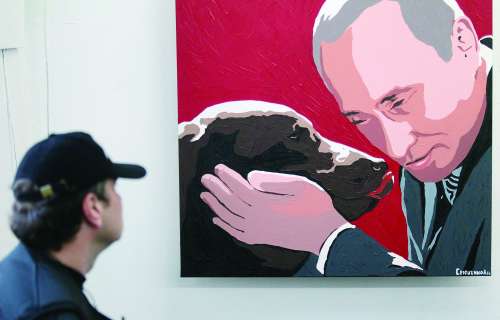 当地时间10月7日,为庆祝总统普京的60岁生日,俄罗斯民众在莫斯科参观俄罗斯艺术家Alexey Sergienko的画展“总统-拥有最善良的灵魂”。