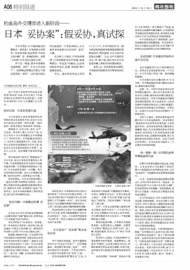 日本共同社于10日放出一条消息,说“日本政府正在研究一份妥协方案,拟在坚持‘不存在主权问题’这一原则的同时采取‘认识到’中方主权主张的立场”。