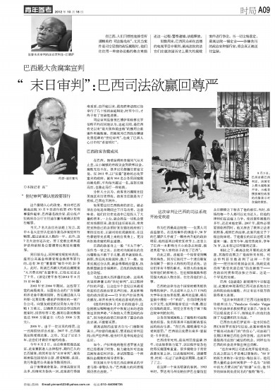 到目前为止,同样被发现犯有洗钱、滥用公共基金和接受现金换票等罪行的,还有38位“重量级”被告中的20多人。此时,距离巴西最大的政治腐败案“大月费丑闻”东窗事发,已经足足过去了7年。(详见《青年参考》2012年8月15日06版)
