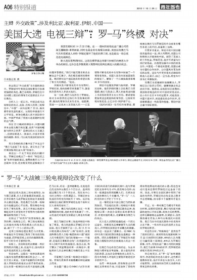 尽管并非重点,辩论中的中国议题依然值得说一说。两人均赞同,美国公司转移到大洋彼岸的中国,剥夺了美国人的工作机会。罗姆尼说,他并不希望与中国打贸易战,而是要加强与中国的贸易合作,中国是一个稳定的国度,美国应成为中国的合作伙伴,让中国具有更负责任的态度。这位与中美贸易关系颇深的候选人还表示,自己一旦当选,将宣布中国为汇率操纵国。