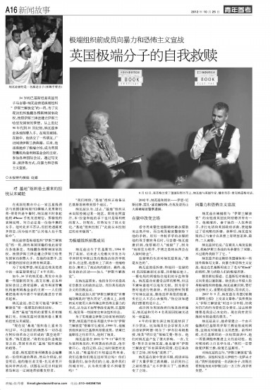 34岁的巴基斯坦裔英国男子马吉德·纳瓦兹曾是极端组织“伊斯兰解放党”的一员,为了实现该组织推翻各穆斯林国家政权,按照伊斯兰律法建立伊斯兰哈里发国家的梦想,从上世纪90年代到21世纪初,纳瓦兹奔走各地招募人手,在埃及被捕。在狱中,他结交了一些朋友,广泛阅读伊斯兰教典籍。后来,他逐渐抛弃了极端立场,成为英国智囊机构奎利姆基金会的主席,参加各种国际会议,通过写文章、演讲等方式,向暴力和恐怖主义宣战。