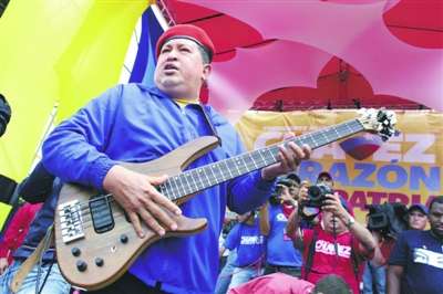 在一场数小时的“反美帝国主义”演讲之前,委内瑞拉总统查韦斯以这样一首墨西哥民谣作为开场秀,旁边还站着吉他手和小号手。