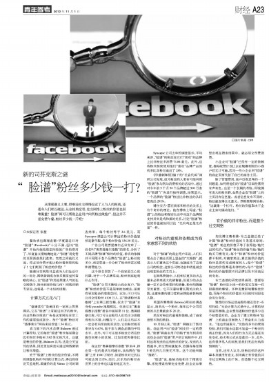关于“脸谱”上粉丝的经济价值,不同的调查机构有不同的计算公式,得出的结论天差地别。最廉价的是Vitrue公司的调查结果:每个粉丝等于3.6美元。而Syncapse调查公司计算出的粉丝价值显然是豪华版:每个粉丝价值136.38美元。