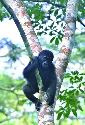 和来路上不同,我们很快有了发现。随着树叶沙沙作响,一群黑色的猩猩蓦然现身,在我们头顶的树枝上荡起秋千。若不是亲眼所见,很难相信它们这么大的块头竟能来去如飞,美感十足。看了一会儿,我忽然忍俊不禁地笑出声来。猩猩们也停下了觅食,紧紧盯住我的举手投足,让人分不清宾主。有几个胆大的家伙索性跳下树来,隔着空地与我对视。此刻,阳光从上方道道倾泻下来,把这些人猿的倒影拉长,乍一看竟如“金刚”般魁伟。