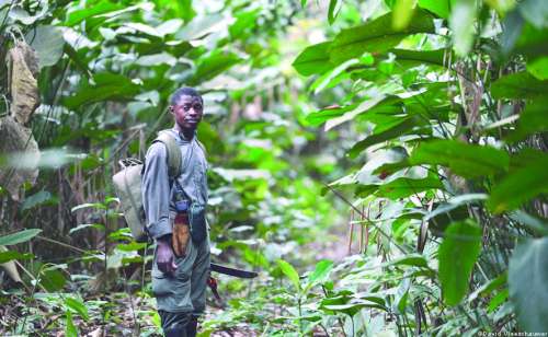 没有动物露面时,我的注意力被向导先生吸引过去。他拎着一把长及大腿的弯刀,身披粗布斗篷,背着上书“Africa Safe-T”的防水包,可谓原始和现代元素的混搭。泽弗林特别擅长在夜间跟踪灵长类动物。从和同事谈话的口气看,这家伙从不缺乏自信。而在他身后,来自瑞士的领队吉尔·艾迪安忙着把砍下的树枝移走,便于客人们顺利通过。