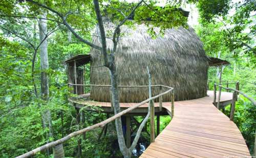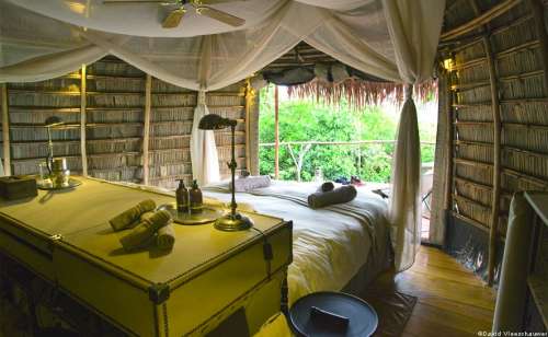 “兰果”旅馆不算宏伟,仅有6个房间,都用漂亮的硬木建成,房顶用酒椰叶覆盖。虽说不少家具还在港口的集装箱里,房间内已经有了淋浴,热水是用煤油炉烧的,算是意外之喜。推开窗户即可俯视林海,沼泽地对面,不时有大象的身影在暮色中若隐若现。