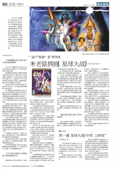 10月30日,迪斯尼公司宣布以40.5亿美元重金,将“星战之父”卢卡斯的同名影业公司收入麾下。迪斯尼将拍摄全新的《星球大战》三部曲,在2015年推出新三部曲的第一部,这也是历史上的第7部“星战”影片。这意味着,当年卢卡斯设想的正剧、前传、后传各三部曲的格局,将在并不久远的将来全部实现。