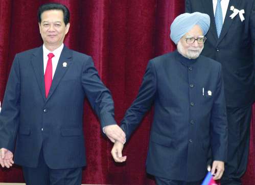 11月19日的第10届东盟-印度峰会中,越南总理阮晋勇牵着印度总理曼莫汉·辛格的手。 |