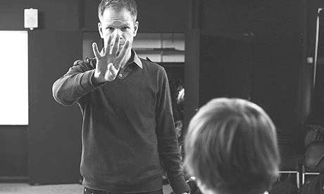 他们的戏剧老师,汤姆·肯特,从一个小组走到另一个小组,观察孩子们的讨论。之所以“观察”,是因为他听不到。一名手语助手跟着他,帮他“翻译”学生们的讨论内容。之后,汤姆对每个小组的讨论给出自己的意见和建议。