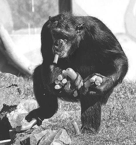 德国新维德市动物园的一只黑猩猩充分展现出了它灵活的身手,居然手脚并用一次性抢走了十几只胡萝卜。