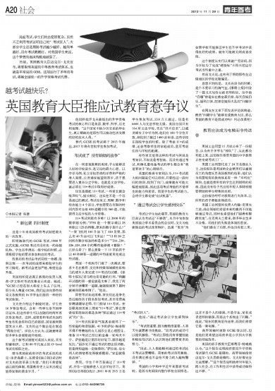 考试让学生如此痛苦,英国的教育大臣却认为考试还“不够劲”。本月中旬参加英国独立学术委员会的会议时,戈夫为他新推出的考试改革辩护,迅速“变身”为“考试狂人”。