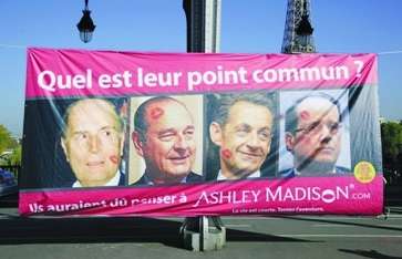 加拿大一家名叫Ashley Madison的网站,专为想出轨的人寻找婚外情机会,并牵线搭桥。最近,这家网站盯上了法国市场。其创始人彼得曼别出心裁地把4位法国总统的头像“借”来做广告,现任总统奥朗德和他的3位前任:萨科奇、希拉克和密特朗,纷纷中招。