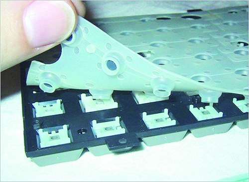 F 80年代后期:橡胶圆顶键盘 键盘“摁下-电路接通-输出字符”的流程,不仅能用弹簧实现,用弹性不错的橡胶结构也能做到。上世纪80年代后期,有人另辟蹊径,设计出了基于橡胶圆顶的按键,这种设计至今仍在许多台式电脑键盘中使用。其基本原理同疏通马桶的皮吸碗类似,用户摁下按键时,橡胶圆顶压缩形成闭合电路并输出字符。松开键盘后,圆顶又会恢复原貌。 |