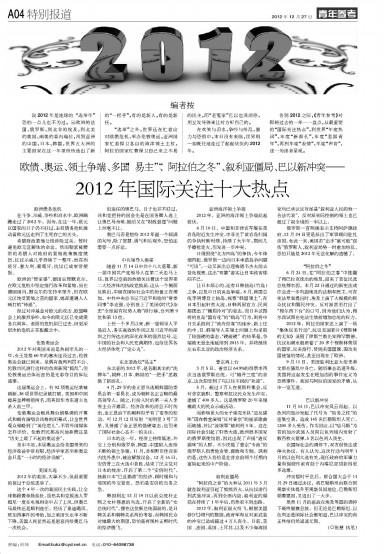 告别2012之际,《青年参考》对即将过去的一年一一盘点,从最重要的“国际关注热点”,到世界“年度热词”、年度“新面孔”、年度“惹眼青年”,再到年度“表情”、年度“声音”,逐一为读者呈现。
