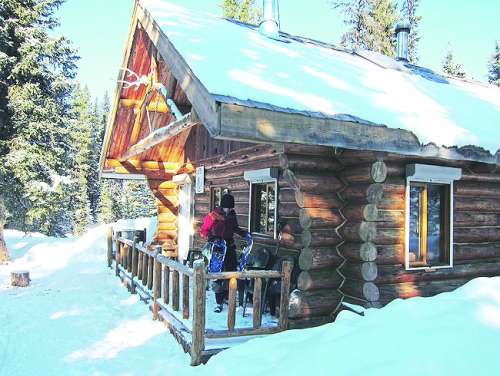 埃尔克湖木屋2004年在加拿大登山俱乐部注册,对我和劳伦这种喜欢远足而又缺乏经验的游客来说,它足够偏远,也不会有半路掉进冰窟或遭遇雪崩的意外。旅程是从卡尔加里市开始的,我们租了所谓的“轻型”滑雪板,比通常的越野雪板宽一点,镶着金属边,可以更容易地在陡峭的坡面上操控,在一望无际、人迹罕至的雪原上滑动也格外轻松。