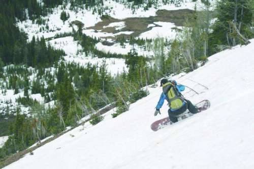 从完全孤立的山顶上俯冲而下,对我们俩来说都是全新的体验。我的两大倚靠,一是软着陆,二就是极佳的运气;轻型滑雪板的表现也非常棒,即便在途中摔倒了好几次,依然毫无松动的迹象。最终,离开停车场4个钟头后,我们站在了埃尔克湖木屋门口。