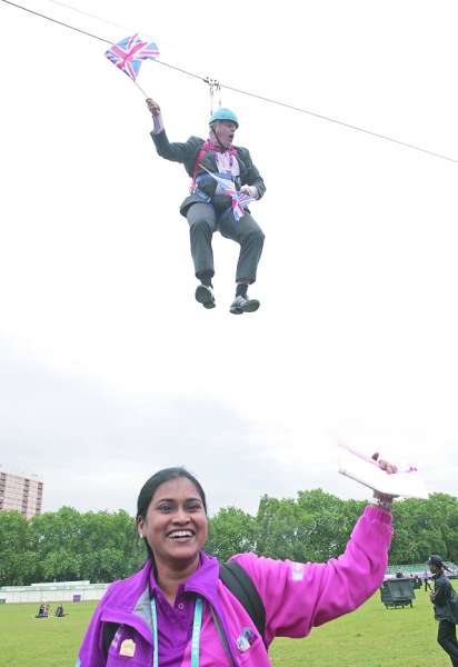 为保证奥运会的“笑果”,在开幕式上差点一跤扑倒在亲王夫人卡米拉膝上的伦敦市长约翰逊,在8月1日那天专程赶赴维多利亚公园做宣传,打算模仿开幕式上“从天而降”的英国女王,也玩一把“空降”,却不幸上演了一出“空吊”。