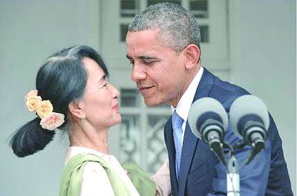 在与缅甸的反对派领袖昂山素季会见记者结束时,奥巴马主动拥抱昂山并顺利“得逞”,可当他提出进一步要求“亲亲脸”时,昂山却似乎并没准备好,一直“左躲右闪”,这让习惯了亲吻礼的奥巴马着实尴尬了一回。