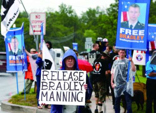 今年6月3日当天,数十名曼宁的支持者冒雨在匡提科海军陆战队基地的主入口前示威,很多人拿着印有他照片的海报。“曼宁声援网络”称,目前已有两万多人募集了125万美元,作为帮他申辩的基金。