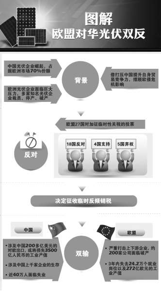 今年4月9日,超过1000家欧洲光伏企业要求欧盟委员会,放弃对中国太阳能企业征收惩罚性关税。中欧首轮价格承诺谈判宣告破裂后,5月24日,欧盟成员国曾就此案进行投票。美国雅虎新闻网称,包括德国、英国在内的18个成员国反对对华征收反倾销税,5个国家弃权,仅有4个国家表示支持。