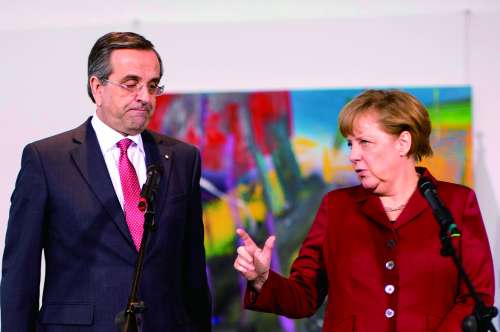 1月8日,德国总理默克尔会晤来访的希腊总理萨马拉斯。 □图片来源 CFP |