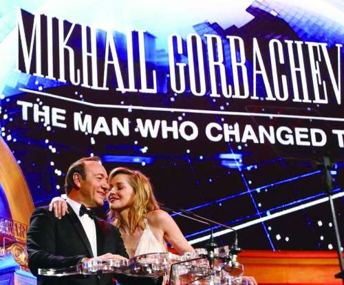 莎朗·斯通(右)与凯文·史派西2011年担任戈尔巴乔夫80岁生日派对的主持人。 |