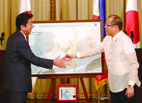 7月27日,菲律宾马尼拉,日本首相安倍晋三(左)与菲总统阿基诺三世在一幅“棉兰老岛和平与发展地形图”前握手。两人在当天的会晤中着重讨论了加强两国在防务、经贸、地区争端特别是对华领土争端方面的合作。图片来源 CFP |
