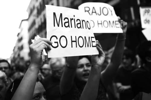 7月26日,一位半裸的抗议者戴着拉霍伊的面具,抗议西班牙的严重腐败。他的手中高举写着“无耻”的条幅,静静地站立在首相府的门前。当天,西班牙超过50个城市的抗议者走上街道,要求拉霍伊下台并且举行新的选举。这场抗议在脸谱上的宣传主题为“拉霍伊再见”。