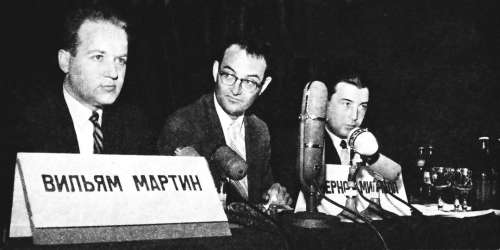 1960年,叛逃苏联的马丁(左一)和米切尔(左二)在莫斯科的新闻发布会上。 |