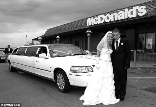 婚礼当天,这对新人乘着加长大轿车来到了经常约会的麦当劳门前,合影接吻,然后在亲朋好友的簇拥下进入了快餐店。人们用绳索圈起了一块地方,作为婚宴现场,新郎新娘以及宾朋纷纷就座。