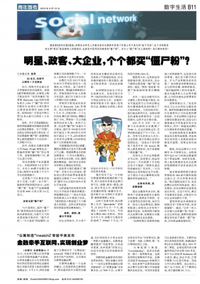 如今,网络中存在着众多买卖假粉丝的在线服务。美国《赫芬顿邮报》称,在推特上购买粉丝是件“容易和廉价”的事情。Barracuda Labs的研究报告显示,1000个“僵尸粉”的平均售价为18美元,5美元便可以使消息获得约2000次转发。某网站的广告更是声称只需52美元就可以拥有1万名粉丝。
