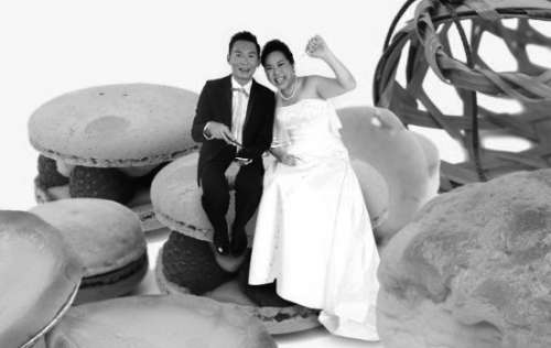 为了反映出新娘喜爱美食的特点,这张新式婚纱照中,两位新人便“坐在了巨大的杏仁饼和蛋挞上”。 |