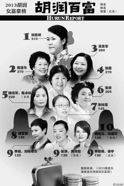 《胡润中国女性富豪榜2013》称,世界上财富超过10亿美元的5位最富有女性中有3位来自中国,跻身世界前十的中国女富豪共有6位。相比之下,世界上前十位最富有男性中没有一位来自中国大陆。