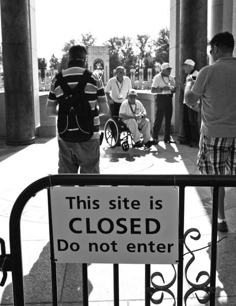当地时间2013年10月5日,美国华盛顿,美国空军老兵试图参观二战纪念馆,重温对战时情景的回忆,但这里已然关闭数天。图片来源 CFP |