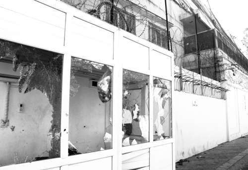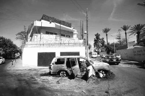 米色高墙上满是弹孔,烧毁的丰田汽车被弃置在破旧的大门前,没有警察守卫着几天来都没什么变化的现场。当地店主告诉英国《卫报》,他们担心还会有新一波攻击到来。