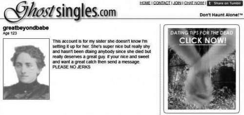 据英国Metro网站报道,最近,一个以“幽灵交友”为主题的网站Ghostsingles.com受到了网友的热捧。它为人们提供了一种新奇的约会方式——和“幽灵”约会。在这里,死亡并不是什么恐怖的事情,而是人们寻找真爱之旅的开端。