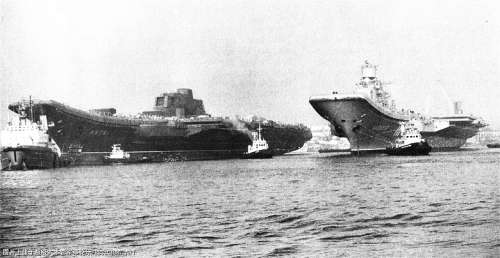 “瓦良格”号(左)与“库兹涅佐夫”号在黑海造船厂的合影 |